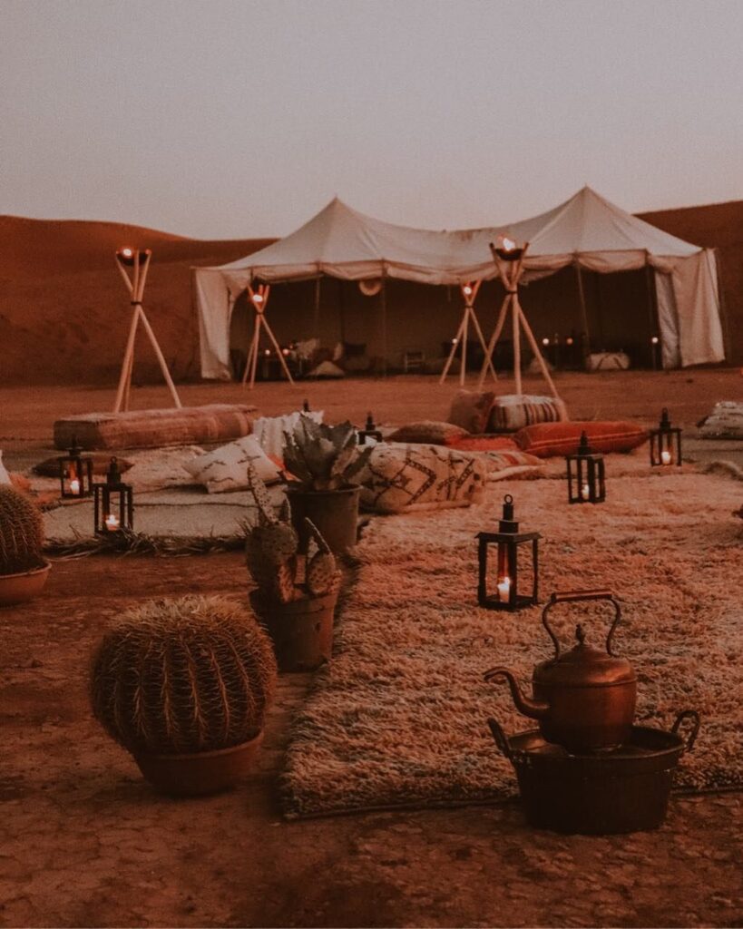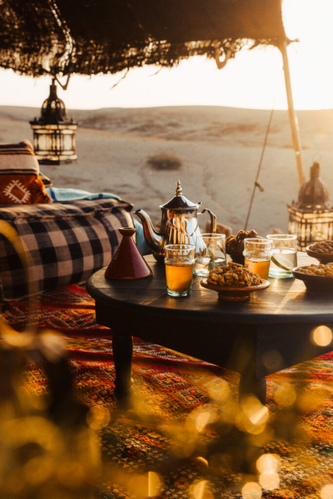 Marrákeš je kromě jiného i vstupní branou do Sahary. Království pouště není jen nekonečně tichým prostorem, kde šepotá písek. Ve skutečnosti je to mystické místo nabízející fantastické možnosti zábavy a poznání. Ideální způsob, jak navnímat poušť v její nedozírné pestrosti, je vyzkoušet glamping. Koncept stylového kempování je v Maroku na vzestupu, horkou novinkou je tábor Caravan Agafay, jenž se otevřel hostům teprve začátkem letošního října. Skýtá možnost proniknout hlouběji do nomádské kultury, ale se vším pohodlím. Kemp zahrnuje dvacet prostorných stanů s přídavkem pětihvězdičkových bonusů jako jsou dva bazény, koňské a velbloudí stáje, kino pod otevřeným nebem, wellness a restauraci Olivar podávající menu postavené na lokálních ingrediencích. Poušť, v noci ozářená tolika hvězdami, není jen cestou k vlastní duši, ale také k polechtání adrenalinu. Ten se vám zaručeně dostane do krve ve štědré porci při sjíždění dun na čtyřkolkách nebo při sandboardingu. Na ideji nomádství zase stojí další glamping destinace s názvem Dune Camp Umnya.