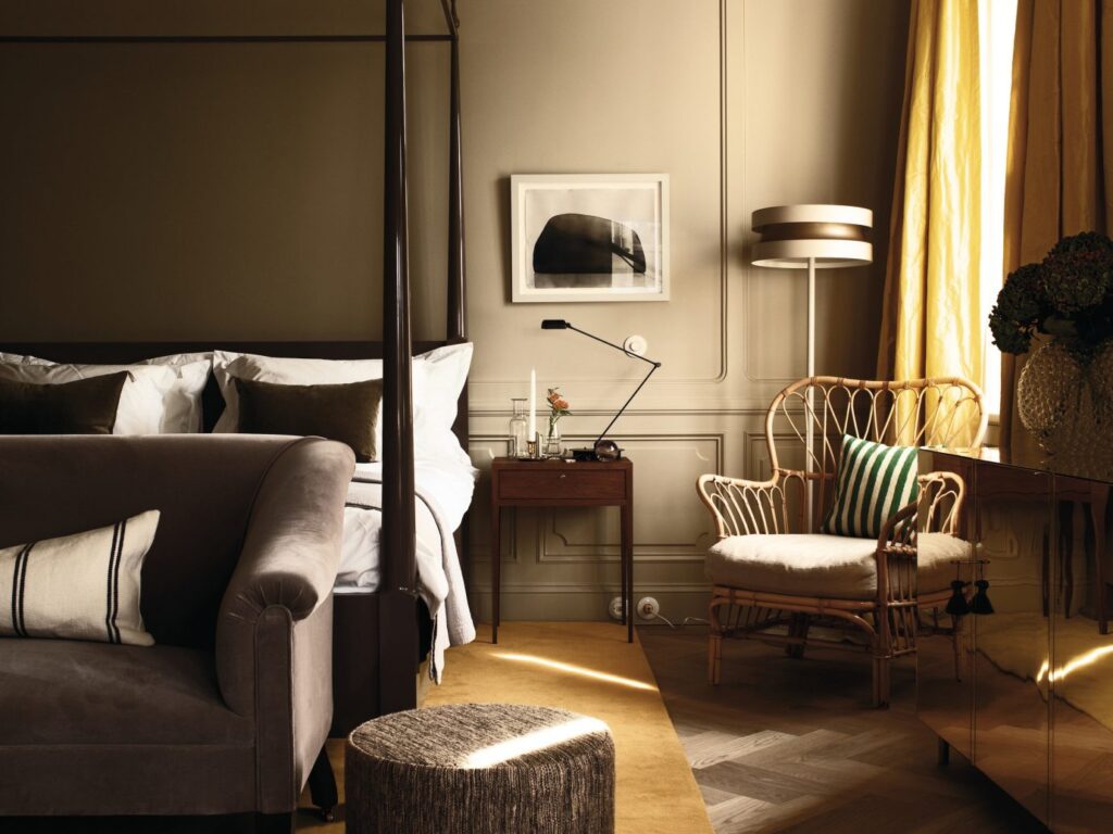 Britská designérka Ilse Crawford na přání majitelky hotelu vsadila na nadčasový design – mramorové koupelny s bronzovými detaily jsou naprosto dokonalé – zároveň ale proměnila každý z dvanácti pokojů v unikát. Zatímco jednomu dominuje kachlová pec z padesátých let, v jiném najdete surrealistické křesílko z dílny dánského génia nábytkového designu Finna Juhla, ideální pro deštivá odpoledne s knížkou.