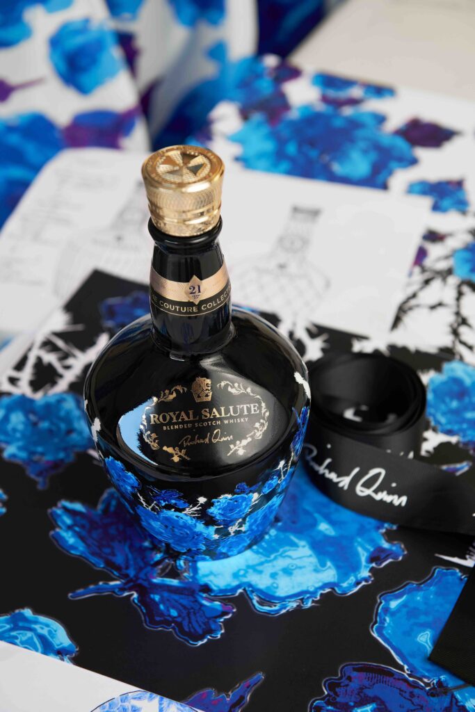 Richard Quinn vystudoval prestižní londýnskou školu umění a designu Central Saint Martins a bujaré květy, těžké perly a originální pojetí latexu jsou charakteristickými prvky jeho stylu. Do stejné vize se rozhodl obléknout i láhev nové whisky. Sběratelská edice byla vyrobena ve dvou variantách, v bílé a černé, přičemž na českém trhu je v prodeji pouze černé provedení. Odvážné pojetí klasického porcelánového flakonu Royal Salute přináší elegantní zdobení modrými okvětními lístky na pozadí bílých trnů, inspirované neobyčejným světem whisky Royal Salute. Oko poutající design v sobě snoubí sofistikovanost s prvky rebelie, což jsou charakteristické znaky Quinnova osobitého designu.
