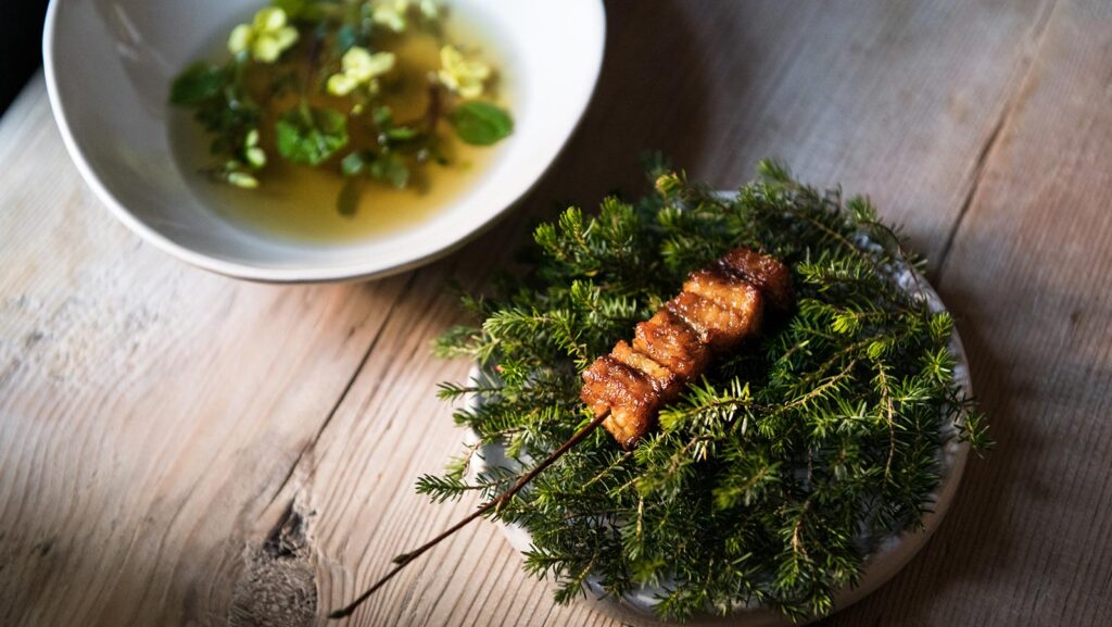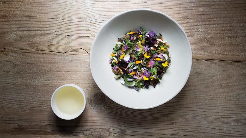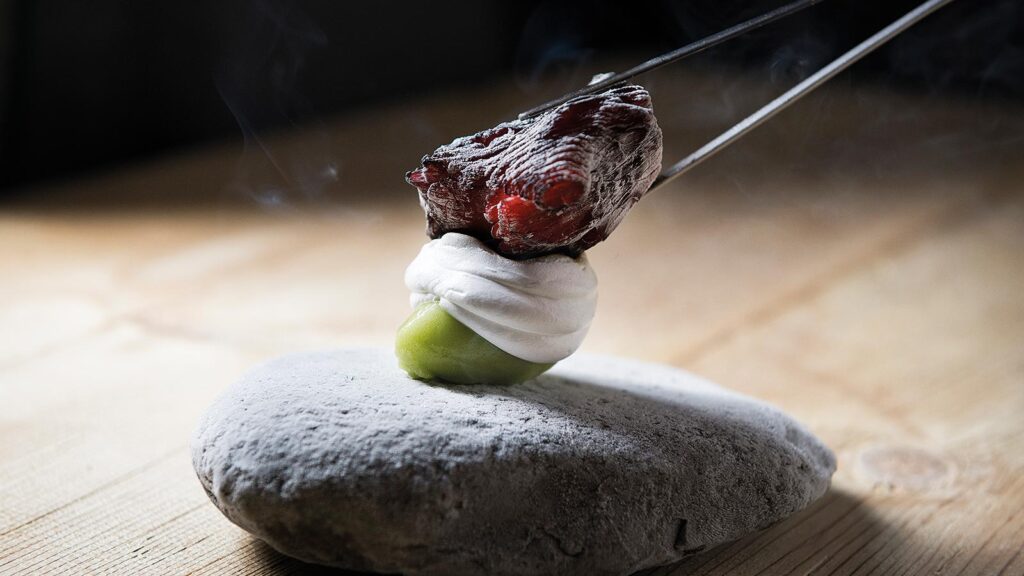 Podobnou jednoduchost a purismus jako u chleba s máslem aplikuje Niederkofler i na svůj tarte tatin servírovaný s čerstvou zmrzlinou z mléka, podmáslí a heřmánku. Nikde se neschovává žádný twist, dekonstrukce, nová interpretace, substituce tradičních surovin – tohle jsou prostě jen poctivá jihotyrolská jablka, křehký korpus a máslový karamel, a přesto vás donutí zmlknout a přestat přemýšlet.