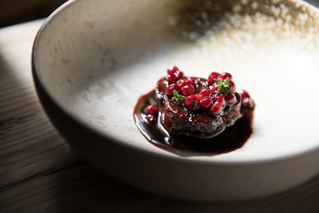 Naším prvním předkrmem menu v St. Hubertus byl zimní salát z pečené zeleniny s fenyklovým olejem a křupavou vodnicí marinovanou v malinovém octu. Na kreaci rafinovaně vytěžující opomíjený potenciál zimní zeleniny navázal chefův signature dish, a sice tatarák ze pstruha s koprovým olejem. A ze pstruha v tomto případě znamená ze všech jeho myslitelných částí od masa přes vnitřnosti až po kůži připravenou jako crumble – jednoduše no waste at its best. Čistě subjektivně mnohonásobně lepší práci s horskými rybami představil další chod, jeden z – opět čistě subjektivně – nejvýraznějších na celém menu, a sice úhoří porchettata. V domácí sójové omáčce a tymiánu marinované a uzené úhoří maso obalené v křupavém lardu, jenž by obstálo jako nejpřímočařejší definice pojmu umami, se zapíjí silným úhořím consomé s pažitkovým olejem, a vinné párování zajištěné minerálním cuvée Blanc Tradition z Chateau D’Arlay v ročníku 2017 tady vystřelí už tak intenzivní chutě do vesmíru. Znáte ten pocit, kdy se nutně musíte zeptat, jak přesně tohle v kuchyni vytvořlli, abyste to mohli neúspěsně zkusit replikovat doma? Tak u úhoří porchettaty byl velmi naléhavý.