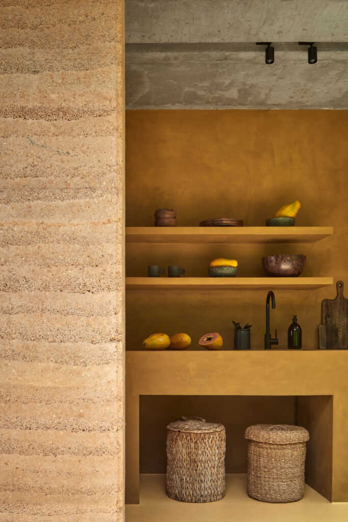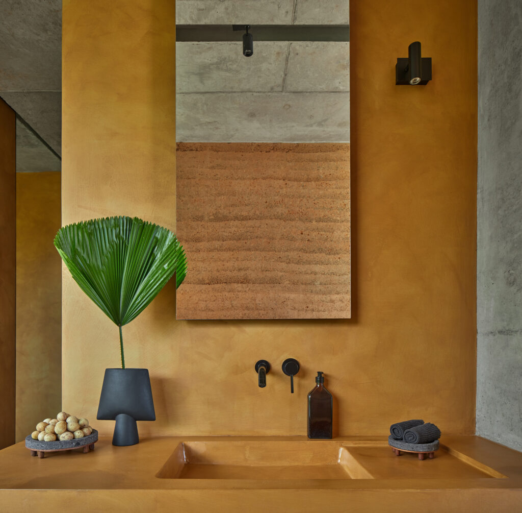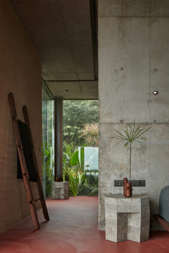 Vzájemné propojení materiálů a stavebně-architektonických prvků je jasnou pointou celého návrhu. Surovou hlínu a beton protínají přiznané ocelové profily podpírající monolitickou stropní desku, přičemž beton pokrytý výrazně probarvenou cementovou stěrkou tvoří také podlahovou plochu. Teplý prvek dodává prostoru kromě barev i na míru vyrobený nábytek z teaku a textilie ze stoprocentního lnu, zatímco některé interiérové prvky včetně solitérních nočních stolků jsou vylité z betonu a hrdě tak přiznávají inspiraci tvorbou belgického designéra Brama Vanderbekeho.