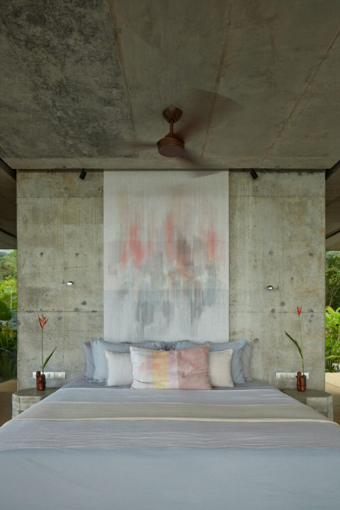 Nenápadné entrée je součástí záměru zachovat autenticitu okolní přírody, do jejíchž útrob se jen pár metrů od vstupu rozprostře fenomenální výhled z otevřeného prostoru hlavní ložnice, která volně přechází do terasy s přilehlým infinity bazénem. Kde by snad mohl vystoupit do popředí jistý chlad ostrých linek, tam je jedním dechem oživen kontrastem barev a bujné zeleně objímající subtilní linie staveb. Velkorysé skleněné plochy fasády s výhledem na oceán jsou vpuštěné do obvodových stěn, které byly vytvořeny jílovitou půdou z výkopů při stavbě a tím daly za vznik vůbec první “rammed earth” realizaci na území Kostariky.