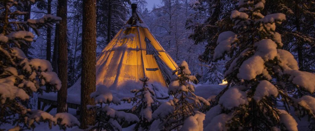 Když opadne prvotní adrenalin z jízdy na ledu a laponské nafialovělé nebe začne růžově hořet a pak šednout, místní ticho a odlehlost mohou na člověka působit až melancholicky. To ale pro tentokrát nebylo v plánu a hladinu adrenalinu jsme si tak doplnili do požadovaných nadstandardů večerním přejezdem Botnického zálivu na sněžných skútrech. Ty mimochodem odhalily skutečný charakter motorizovaného cestování po ledě, které člověku rozproudí krev v žilách natolik, že se mu i v místních patnácti pod nulou orosí čelo. Když pak na dohled cíli skoro hodinového rodea zjistíte, že na břehu ve tmě problikává kožené tee-pee, finálně propadnete drsné romantice severu. Skútry odstavujeme, jeden po druhém příjemně unavení roztahujeme oponu tee-pee, v jehož středu je nad ohništěm postavená očouzená cínová konvice plná horké brusinkové šťávy a na otázku zda si ji dáme s vodkou nebo bez odpovídáme jednoznačně. Je čas začít trávit zážitky z dlouhého dne a těžká uzená vůně kouře je k tomu ideálním podkresem. Skål!