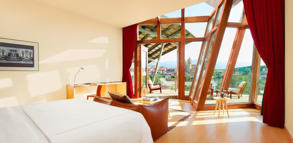 Ubytovat se můžete ideálně v highlightu celého hotelu, Gehry Suite, s asymetrickým designem, který rámuje idylický výhled na historické okolí. Interiér je překvapivě harmonický i díky selekci přírodních tónů, vysokým stropům v loftovém duchu a cenným upgradem je zcela jistě také rozlehlá terasa, na níž si se sklenkou v ruce budete moct užít výhled na terakotové střechy ve vesnici Elciego, majestátní hory Cantabrians a samozřejmě také na oceňované vinice. Noc v Gehry Suite vyjde cca na 24 740 Kč za noc.