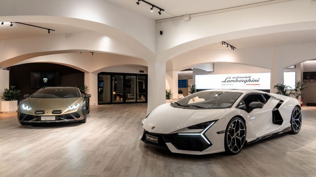 Uvnitř jsou hlavními hvězdami dva nejnovější super sportovní vozy ze Sant’Agata Bolognese. Nové Lamborghini Revuelto3 září v bělostném tónu Bianco Monocerus jako první supersportovní V12 plug-in hybrid HPEV (High Performance Electrified Vehicle) značky a představuje další krok směrem k elektrifikaci podle firemní strategie Direzione Cor Tauri. Po jeho boku se Huracán Sterrato4 v barvě Verde Gea vymyká očekávání. Je eklektickým prvním terénním vozem – vyrobeným v pouhých 1499 kusech, a všechny jsou vyprodány.
