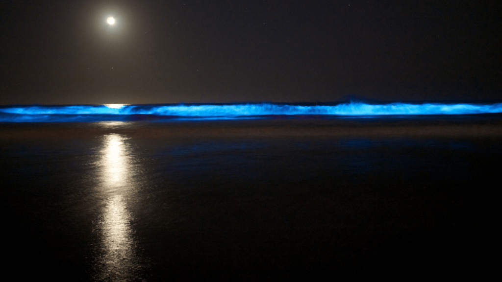 Za tento jedinečný magický jev může fytoplankton, který má schopnost bioluminiscence. O co  přesně jde? Jedná se o proces, ke kterému dochází, když se plankton dostane do kontaktu s kyslíkem a způsobí tím chemickou reakci. Vznikne při tom protein zvaný luciferin. Při pohybu vody se spojí s enzymem a chemická energie se přemění na světelnou. Proto jsou tato modrá světla k vidění u břehu, ve stopách v písku nebo ve vlnách, které křižují surfaři.