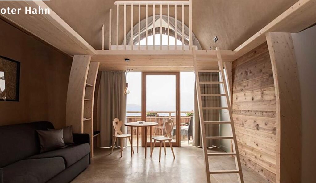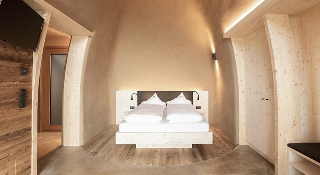 Každý apartmán/pokoj má oblý tvar, který vytváří podivuhodnou náladu, kuchyňku, koupelnu a – výhled z kopců na Plose, Geisler nebo Schlern. „Použili jsme i dřevo z původní stodoly, máme topení v podlaze, ale ne pod postelí, a jsme bezbariéroví,“ ukazuje zajímavé detaily.
