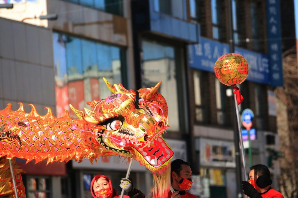 Zábava v ulicích neodmyslitelně patří k oslavám Nového roku. Tyto přehlídky v doprovodu čínského draka jsou plné vzrušení. Draci bývají obrovští a jejich vzezření je propracované do nejmenších detailů. Lví a dračí tance jsou důležitou součástí oslav. Drak je v Číně uctíván a symbolizuje samotnou zemi. Lvi, stejně jako hlasité ohňostroje, mají za úkol odhánět zlé duchy.