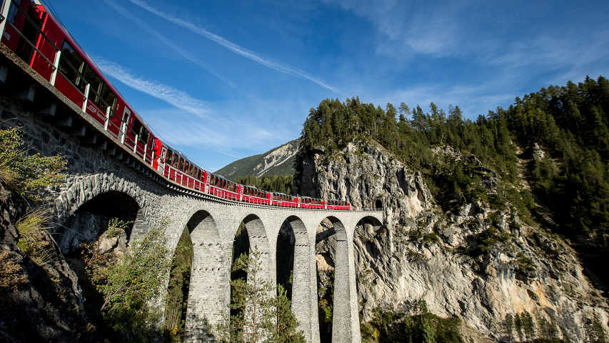 Bernina Express je vlak jedoucí rychlostí asi 20 kilometrů za hodinu, čímž sice zesměšňuje své jméno, ale nabízí tak úžasnou trasu, že Berninská dráha, po níž vede, zaslouženě získala místo na seznamu UNESCO. Požitkářská jízda začíná v Churu, nejstarším městě Švýcarska, a vede až do krásného města Tirano v severní Itálii. Vlak má jasně červenou barvu a vine se po úzkorozchodné trati, projíždí 55 tunelů a překonává více než 196 mostů, které jsou většinou ukotveny ve vápencových skalních stěnách vysoko nad peřejemi smaragdově zelených řek. Vlak disponuje panoramatickými okny, díky nimž je možné naplno si užívat úchvatné scenérie, jimž dominují malé vesničky, louky plné krav, čisté řeky a bohaté lesy.