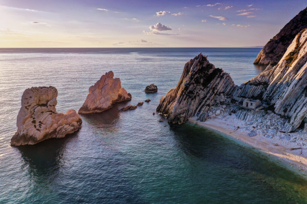 Hlavním městem Marche je Ancona, jeden z nejdůležitějších přístavů Jaderského moře. Pyšní se nejenom slavným Trajánovým obloukem, ale také unikátní katedrálou San Ciriaco, která dominuje vrcholku kopce Guasco. Výhled na modrý obzor a zátoku je odtud osvěžující podobně jako sklenka místního bílého vína zdejší typické odrůdy Verdicchio. Jižně od Ancony se krajina dramaticky mění. Z vln se zvedá impozantní masiv Monte Conero a pod jeho útesy se skrývají pláže, které vypadají, jako by je stvořil impresionistický malíř. Sirolo, jedno z nejpůvabnějších městeček oblasti, je pastelová pohádka s úzkými uličkami, kde vás každá zatáčka odmění pohledem na moře. Pláže Due Sorelle s dramatickými skalními útrvary, dostupné jen lodí, jsou magické. Místní říkají, že když se tady brzy ráno ponoříte do křišťálově čistého moře, ucítíte, jak se vám tělem rozlévá klid celého vesmíru.