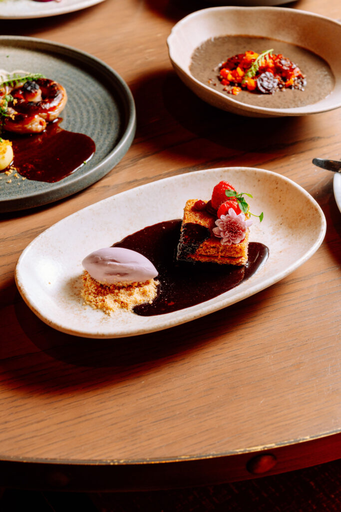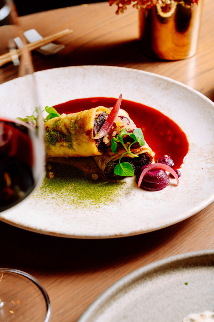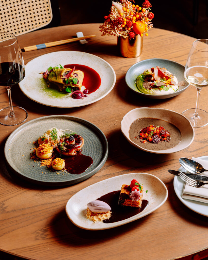Hlavní chody vzdávají hold ikonickým vánočním chutím. Vinná klobása s okurkovým gelem, kysaným zelím a uzenou bramborovou kaší představuje moderní interpretaci klasického stánku a pomyslný symbol českého svátečního stolování se objevuje jako trhané kachní maso s lokšemi, pyré z červeného zelí a kachními škvarky.