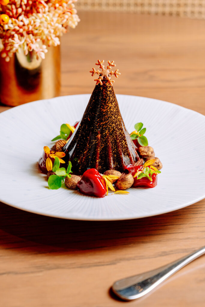 Závěrečný chod v podobě dekadentního perníku s marmeládou z malin, horkou čokoládou a zmrzlinou se svařeným vínem dokonale evokuje vůni a atmosféru adventních ulic.