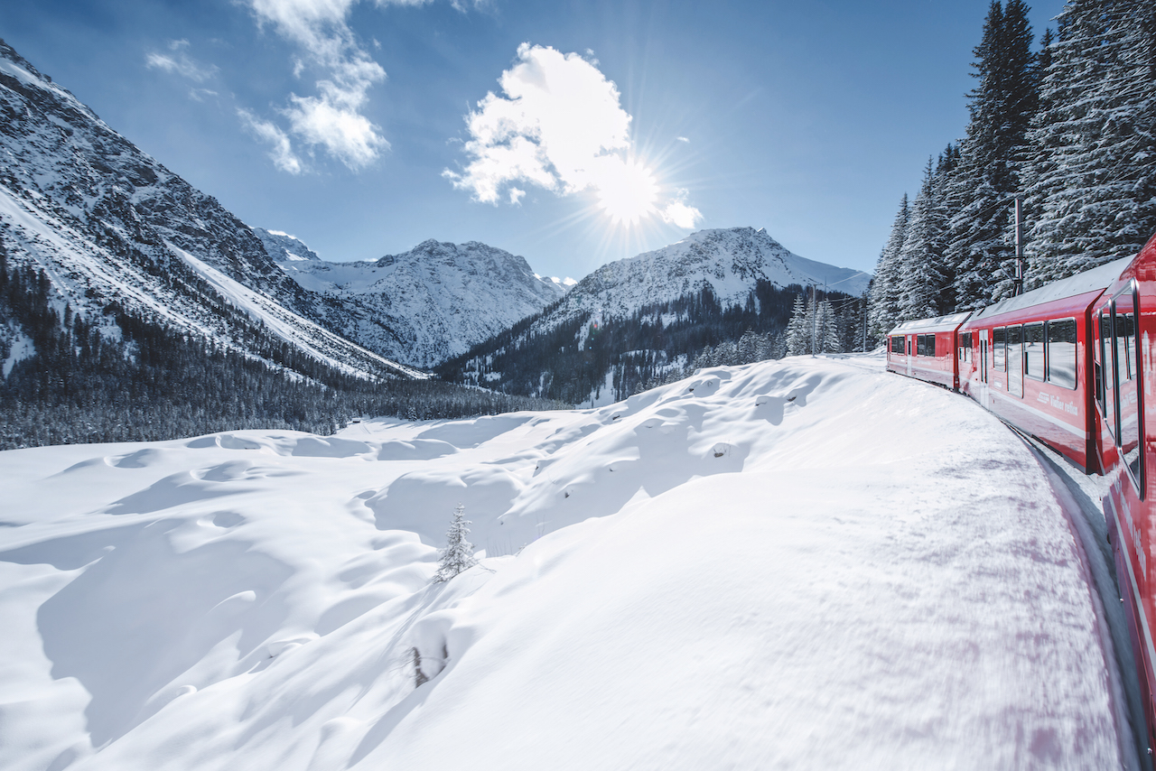 Že ledovce a palmy nemají nic společného? O opaku vás přesvědčí jízda panoramatickým vlakem Bernina Express, který vás sveze z alpského města Chur až do italského Tirana a který během čtyřhodinové jízdy projede 55 tunely a přes více než 190 mostů. Stačí nastoupit, usadit se u okna, otevřít láhev švýcarského vína, přikusovat sýr a sledovat, jak se za sklem střídají scény jako z filmu: třpytivé ledovce, zamrzlá jezera a zasněžené pláně dělají z jízdy jedinečný vizuální zážitek.