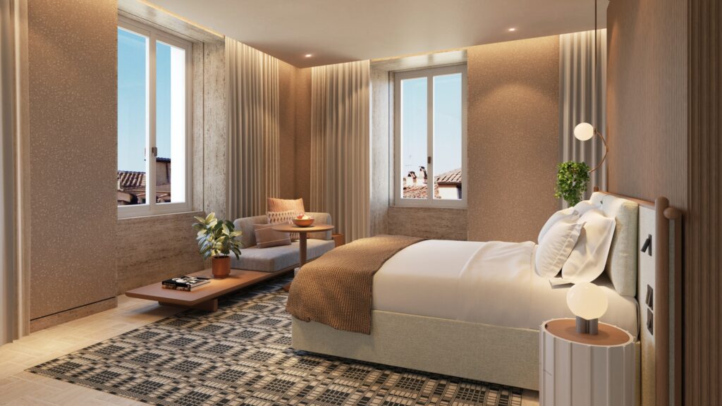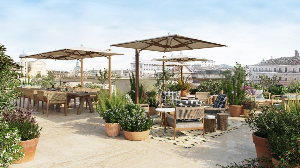 Ubytování zrcadlí římský genius loci dokonalou selekcí hřejivých béžových tónů s přírodními materiály a dřevěnými akcenty v 95 pokojích, jejichž highlightem je Lata Suite se dvěma ložnicemi a prostornou terasou s výhledem na historické centrum Říma.