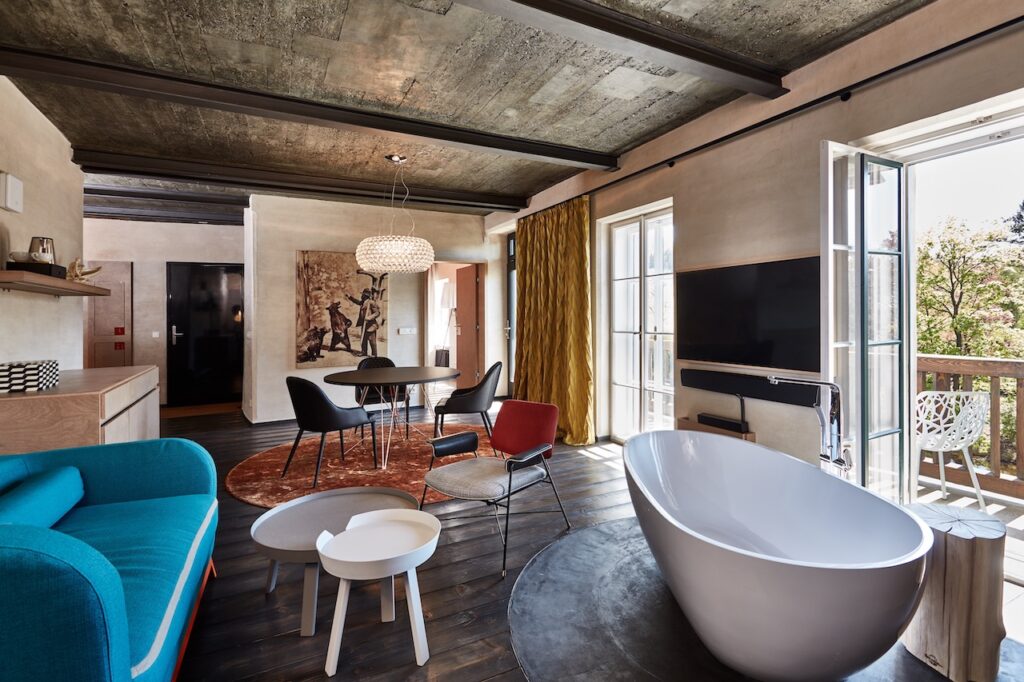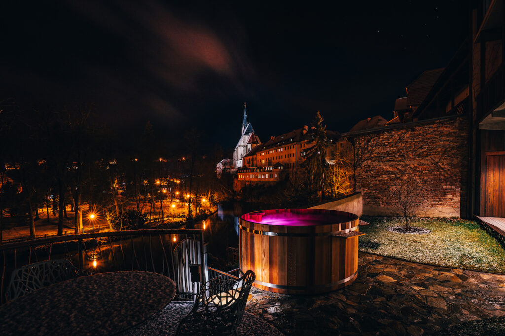 Jednotlivé apartmány nesou v duchu minimalismu pouze číselná označení, tedy 1, 2 a 3. Dominantou apartmánu číslo jedna, který je situovaný v podkroví, je měděný destilační kotel odkazující na profesi současného majitele domu – dováží totiž do Česka prémiové destiláty. V tomto konkrétním kotli sice rozhodně nic nevypálíte, můžete si pod ním ale alespoň rozdělat oheň v krbu, a zpříjemnit si tak večer. Jeho hlavním programem může být třeba koupel v romantické volně stojící vaně. Tu nabízí i apartmán číslo dvě a zbývající trojka, nejmenší z nabídky, zaujme dřevěnou vířivkou na terase s výhledem na řeku a kostel svatého Víta.